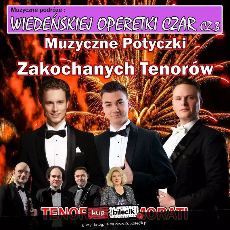 "Wesoły i frywolny teatr muzyczny". W trakcie Gali Operetkowej "Muzyczne Potyczki Zakochanych Tenorów" - Wiedeńskiej Operetki Czar cz.3 zaśpiewają dla Państwa wybitni artyści sceny operetkowej. Ich wspaniałe głosy przeniosą nas w świat koncertów wiedeńskich, operetki, oraz musicali. "Wielka sława to żart"...tą najpopularniejszą operetkową arią świata zapraszamy miłośników muzyki na koncert okrytych nieprzemijającą sławą przebojowych arii i duetów z oper, operetek i musicali a także neapolitańskich pieśni i standardów światowej sceny pop.